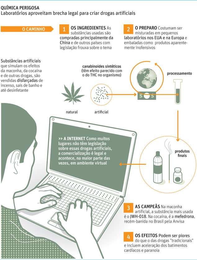 Com algum conhecimento de química e os ingredientes certos, é possível criar drogas artificiais com os mesmos efeitos da maconha, da cocaína e de outros entorpecentes ilícitos. E com um diferencial: muitos deles podem ser vendidos legalmente aproveitando brechas na legislação.